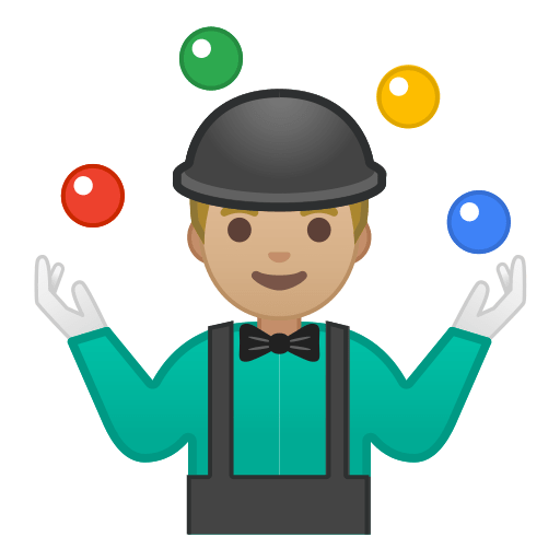 | Deutsch | Jongleur(in): mittelhelle Hautfarbe | Jongleur(in), Multitasking, geschickt, jonglieren, mittelhelle Hautfarbe |