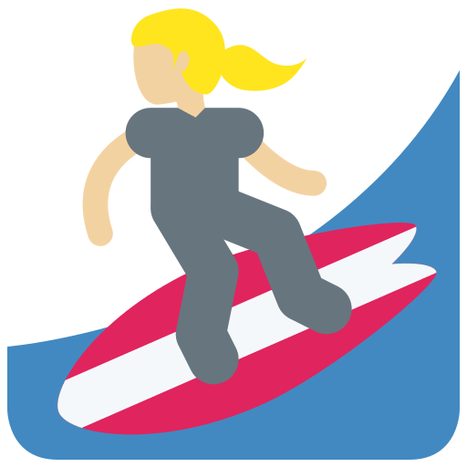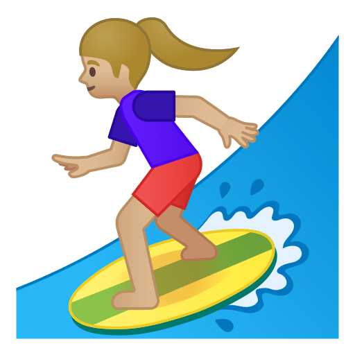 This is a female-gendered variant of the Surfer Emoji / Person Surfing Emoji with a medium-light skin tone applied. The Woman Surfing: Medium-Light Skin Tone Emoji was added to the Skin tones category in 2016 as part of Emoji 4.0 standard. This is a fairly fresh emoji, so its support may be limited on some devices.