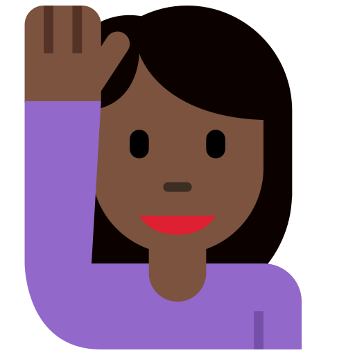 This is a variant of the Hand Up Emoji / Person Raising Hand Emoji with a dark skin tone applied. The Person Raising Hand: Dark Skin Tone Emoji was added to the Skin tones category in 2016 as part of Emoji 3.0 standard. This is a fairly fresh emoji, so its support may be limited on some devices.
