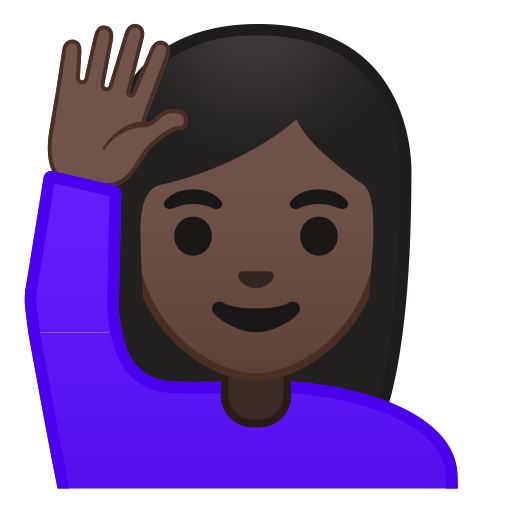 This is a female-gendered variant of the Hand Up Emoji / Person Raising Hand Emoji with a dark skin tone applied. The Woman Raising Hand: Dark Skin Tone Emoji was added to the Skin tones category in 2016 as part of Emoji 4.0 standard. This is a fairly fresh emoji, so its support may be limited on some devices.